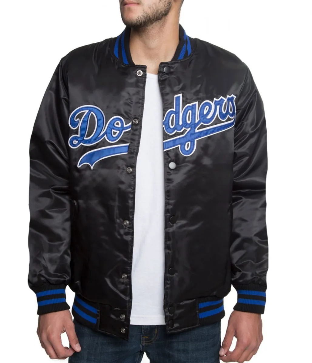 The MLB Unisex Los Angeles Dodgers Black Varsity Satin Jacket delivers sleek, sports-inspired style with a glossy edge made for true fans. Crafted from smooth, high-shine satin, this jacket features the iconic LA Dodgers logo on both the chest and back, framed by bold ribbed collar, cuffs, and hem that complete the varsity aesthetic. Its classic black base brings modern minimalism, while the striped accents inject athletic detail. The snap-button front closure, soft interior lining, and side pockets ensure it’s as functional as it is eye-catching. Designed for game days, streetwear moments, or everyday styling, this jacket offers versatility and a proud nod to team heritage. Whether layered casually or styled with bold intention, it stands as a must-have staple for baseball enthusiasts and fashion-forward fans alike. Bring your team spirit into the spotlight with this standout satin piece, available at Party Jacket.